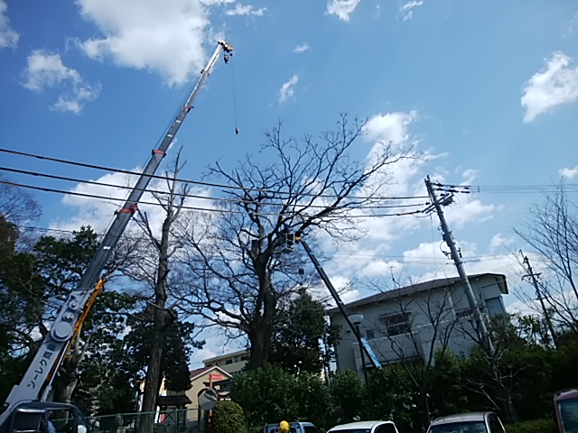 大きな木だけあって機材もたいへんで大小のクレーン車2台で、小に載った作業員がかなり高いところの枝を電動で切り、その枝が下に落ちたらたいへんなので大きなクレーンを使ってロープで引っ張り上げています。電動のこぎりの音が辺りにこだまして大きな工事をしているように思えたのですが、大木の枝切りでした。