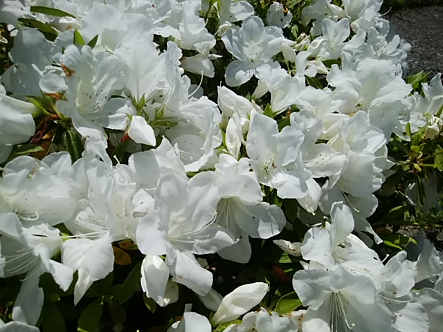 昼過ぎに家の近所を散歩しました。もうほとんどのツツジが店じまいを始めていると思っていたら、こんなにあざやかに白い躑躅が咲き誇っていました。