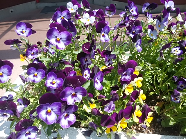 春爛漫という感じででっかいコンクリートの中のパンジーやビオラたちの顔が喜んでいました。モンキーフェースというのでしょうか?みんな真面目に咲いていました。