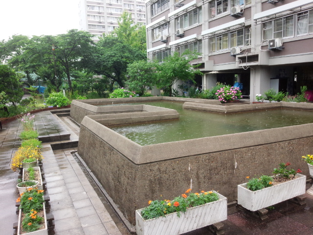 コンクリートの池の向こうにピンクのアジサイが見えるでしょう。小さく映っていますが、アジサイの花群れがポツンポツンと植わっています。このコンクリートの池には大きな鯉と赤い金魚が泳いでいたのですが、最近はあまり姿を見ません。池の水を抜いての掃除のときには、中央の小さなへこみにいくつかの魚が並んでピチピチしているのが見えました。