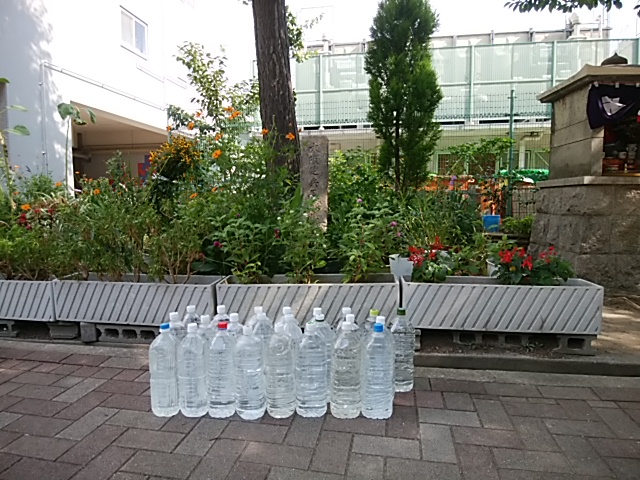 水がいっぱい入ったペットボトルがずらーっと並べて置かれていました。地蔵盆が近づいているからでしょうか?それとも8月14日の空襲に関係してお供えしているのでしょうか?