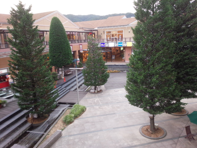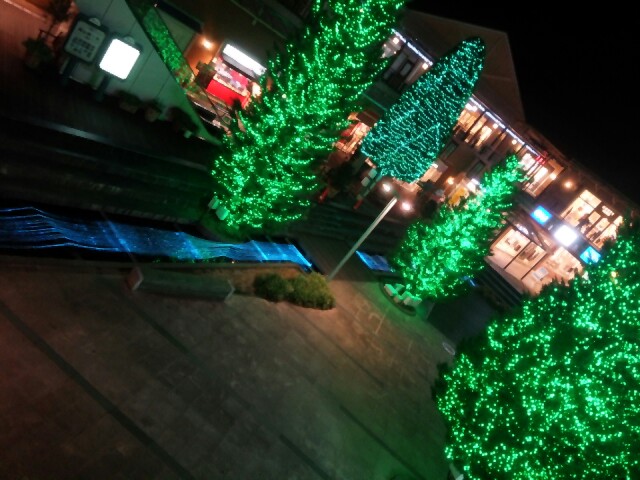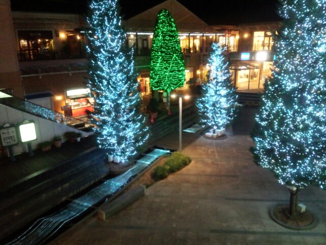 箕面キューズモールで撮影しました。日没少し前の東ショッピングゾーンの中庭です。大きな木の中に白い小さなつぶつぶが見えますか?左側の小さな溝の中に細長いビニールのようなのがたくさん並んでいました。