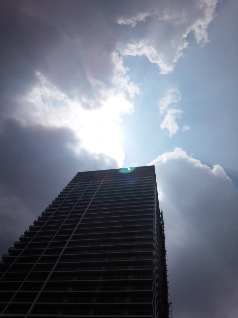 JR高槻駅前(たかつきえきまえ)の高層(こうそう)マンションです。41階(かい)建(だ)てらしいです。上(うえ)を向(む)きすぎてあごが痛(いた)くなりました。