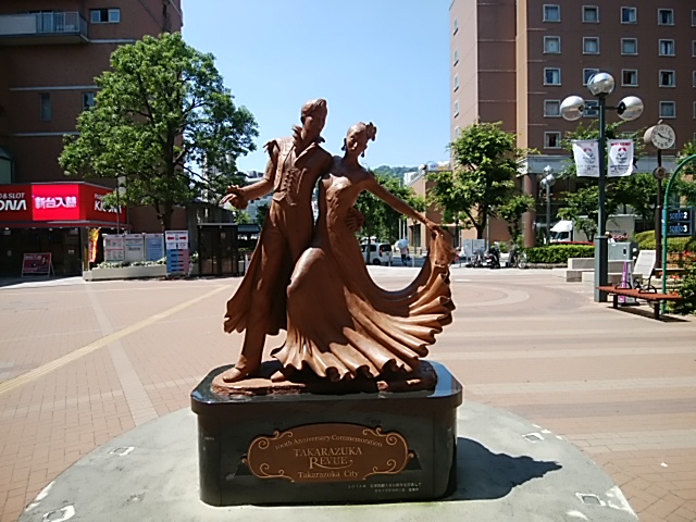 かなりの日差しで暑い暑い阪急宝塚駅前のメイン道路の真ん中で鎮座ましますレビュー像です。