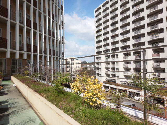 大阪城が見えますか?中央のビルの上に青い天守閣の屋根が見えるのですが、わかるでしょうか?ビルとビルとの間に挟まれた青い空と白い雲の下に微かに見えるお城の屋根。風は寒かったですが、春の光りが溢れていました。
