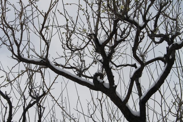 『近くの天神さんの白い梅の花が咲き始めてるよ』と近所に住む知り合いから教えられ、この前の雪の降った日曜日に天神さんに出かけてみました。真っ白な雪景色の中でよーく見ると小さな梅の花が咲いていました。斜めに伸びた枝の上に平行して雪が積もっていました。ぽつんぽつんと小さな梅の花が見えるでしょう。この花たちも驚いたでしょうね。