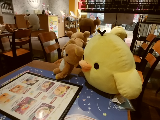 ちょっと離れたところのテーブルの様子です。メニューのしたから顔を出しているキイロイトリの向こうには仰向けに寝っ転がっているコリラックマがいます。