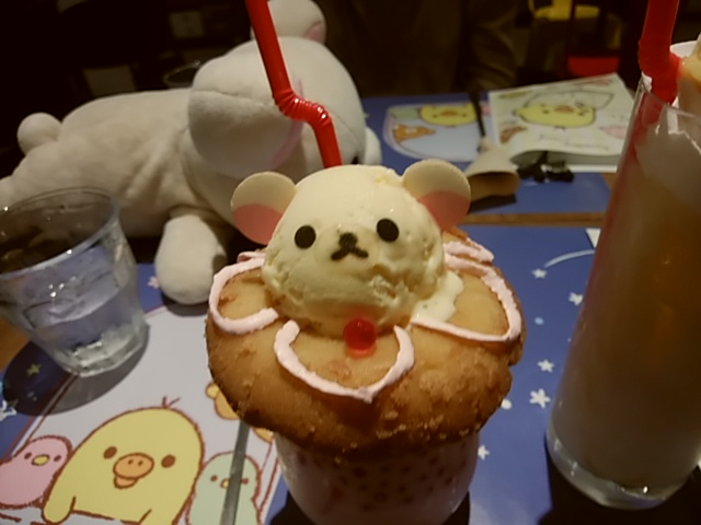 私の注文した『コリラックマのひんやりイチゴミルク』です。アイスクリームのコリラックマの下はドーナツでした。イチゴミルクの中には赤いつぶつぶが入っていて、店員さんがコラーゲンだと教えてくれました。