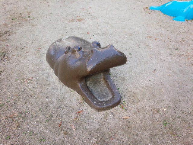 カバくんとアシカさんが道に向かって大きな口を開けていました。