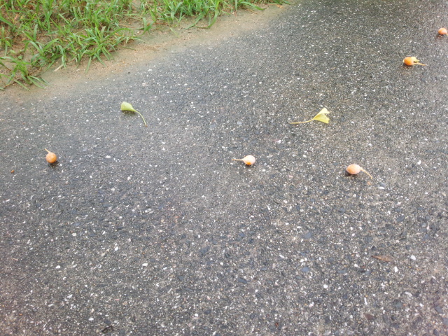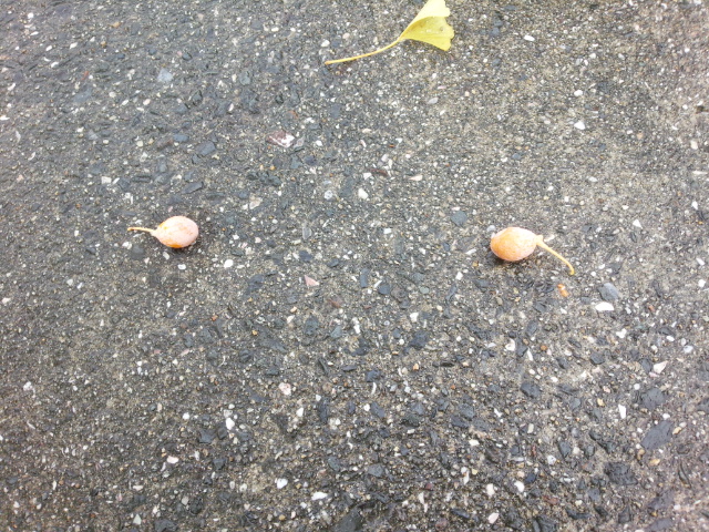 今朝、いつもより一つ前のバス停まで歩きました。普段通らない道の足元に銀杏の実が落ちているのを見つけました。アスファルトの道路に落下してもつぶれることなく元気そうに転がっていました。