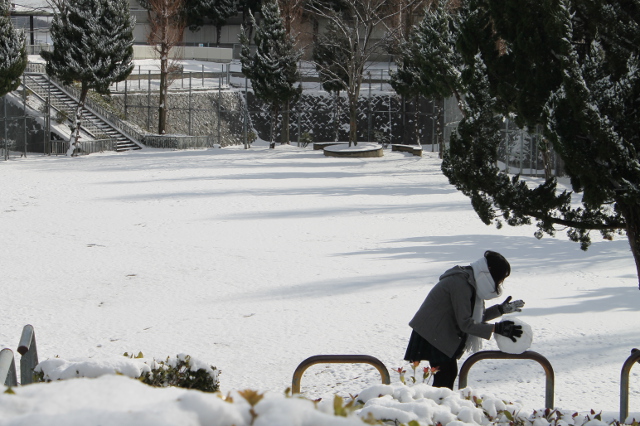 図書館の近くの公園では、女の子が雪だるまの頭を作ったようで大きなボールを抱えて柵の上に載せていました。
