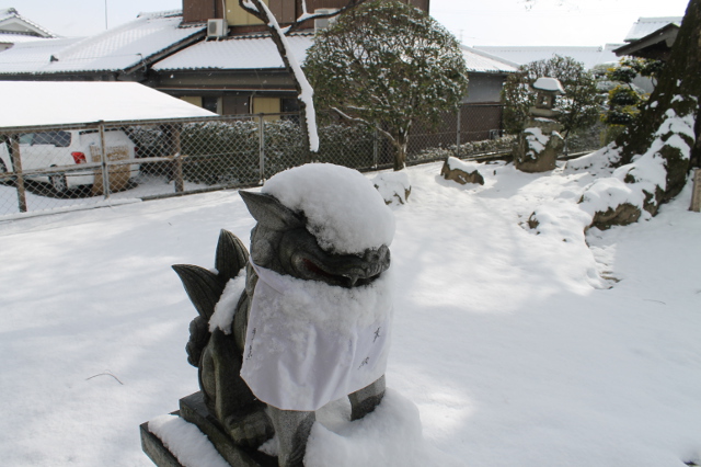 勝尾寺川を遡って天神さんまで歩きました。狛犬が頭から雪をかぶり、2ひきの狛犬がお互いを見て笑っているように見えました。