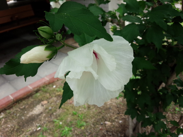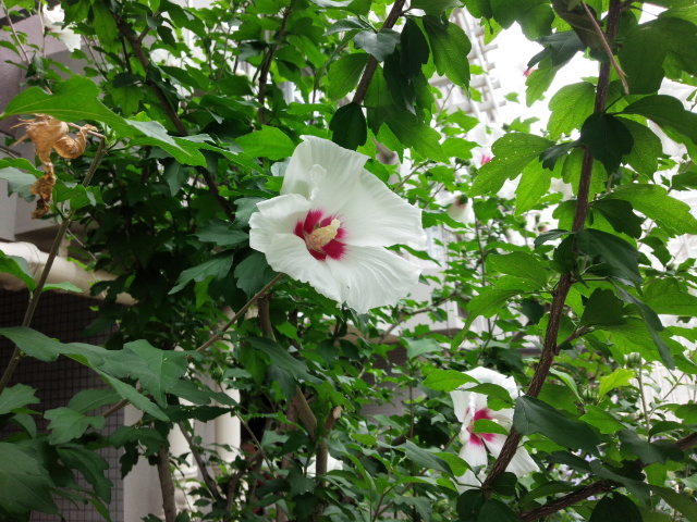 森之宮(もりのみや)で芙蓉(ふよう)の花(はな)が咲(さ)いていました。蒸(む)し暑(あつ)い一日(いちにち)でしたが、白(しろい)い花弁(かべん)が薄(うす)く透(す)き通(とお)るように開(ひら)いていました。