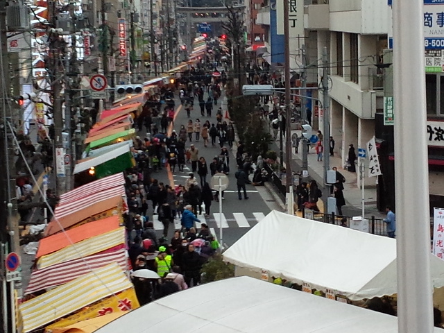 向こうに見える大きな石の鳥居が上宮天満宮の入り口です。小雨の中、屋台がずらーっと並びたくさんの人がお詣りに来ていました。