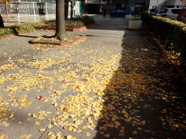 大阪森之宮のイチョウの木もそろそろ落葉です。この街のイチョウの木は雄の木ばかりでギンナンの実はほとんど見られません。黄色い葉っぱが道一杯に広がって時折吹く木枯らしに身をまかせてあっちこっちへ動いています。