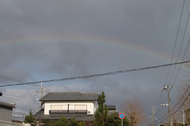 肌寒い冬の朝です。小さな小さな雨粒が車のフロントガラスにふりかかっていました。重い空が広がって外へ出る気もなかったのですが、なぜか何かが心に引っかかってドアを開けて外に降り立つと北の方角に大きな虹が架かっていました。車中での視野の中にこの虹が入っていたのでしょうね。