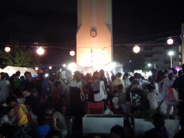今夜は『みのお東 de 愛 納涼大会』コノミヤの前の水道塔の広場で納涼大会が開かれています。8時過ぎにおとずれると近づくにつれてワーンワーンと音楽と人の声が聞こえて来て、人の多さに驚きました。
