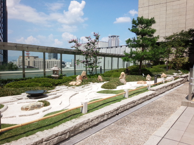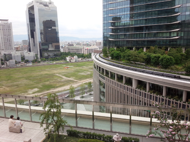 ここは大阪駅の時空の広場からエスカレーターを乗り継いで上がってきたたぶん10階屋上です。秋になればもっともっと気持ちいい場所なんでしょうね。そうなれば人も増えるでしょうが。