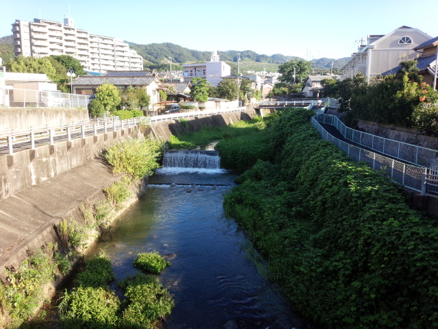 箕面の勝尾寺川です。このところの雨降りでかなり水かさが増えていました。この川の少し上流にカモが3羽飛来しているそうです。もしかするとこの夏を日本で過ごしたカモかも知れません。中央に見える小さな段差で滝のように水が流れ落ちていてその音がゴーゴーと聞こえてきました。向こうの方に見える山は箕面から茨木の北の方に伸びる北摂山系です。あの稜線が東海自然歩道のあるところなんでしょうね。涼しくなってきたのでまた山歩きがしたくなりました。