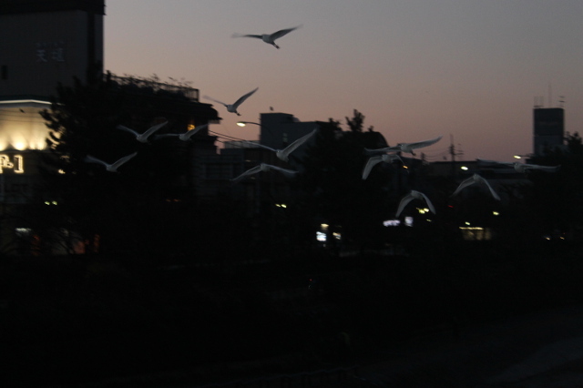 賀茂川が白々と開け始めた頃です。四条大橋の上を都鳥が飛んでいきました。