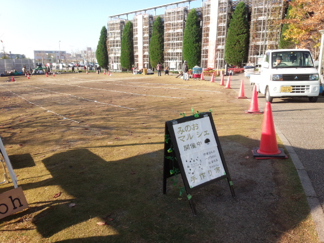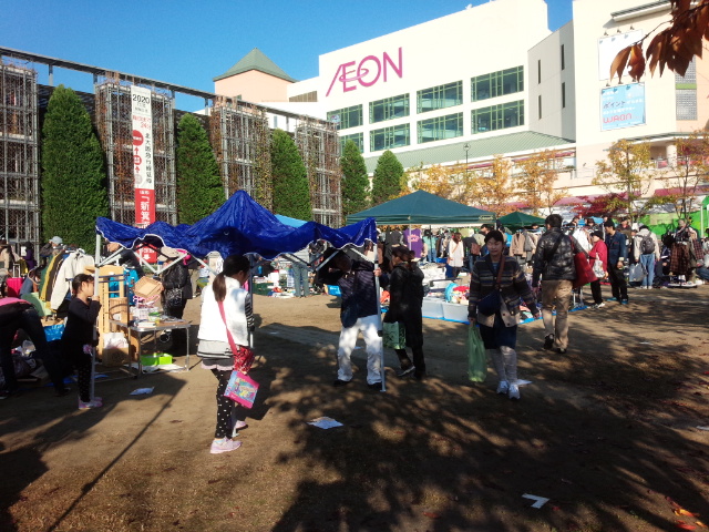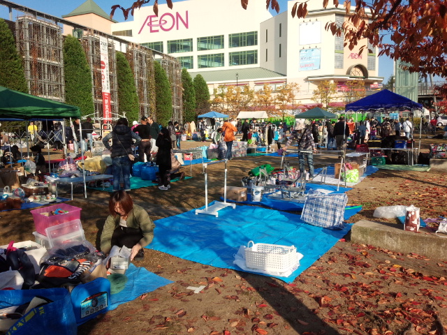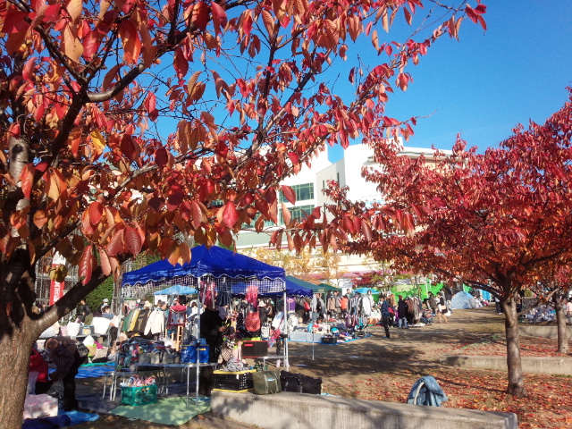 昨日(きのう)、勤労感謝(きんろうかんしゃ)の日(ひ)に箕面(みのお)のヴィソラのかやの広場(ひろば)で行(おこな)われたフリーマーケットの準備(じゅんび)風景(ふうけい)です。隣(となり)の駐車場(ちゅうしゃじょう)からどんどんと商品(しょうひん)を運(はこ)んできて与(あた)えられた区画(くかく)のところにそれぞれが小(ちい)さなお店(みせ)を作(つく)っていきます。開始(かいし)1時間半前(じかんはんまえ)の8時半(じはん)ぐらいの様子(ようす)です。