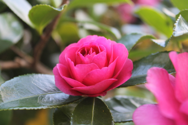 山茶花(さざんか)の花(はな)でしょうね、薔薇(ばら)咲(ざ)きながら花弁(かべん)の厚(あつ)さでどこか異質(いしつ)な感(かん)じがしています。