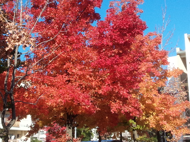 箕面市内(みのおしない)、朝(あさ)九時頃(じごろ)に朝陽(あさひ)を浴(あ)びて輝(かがや)く紅葉(もみじ)です。