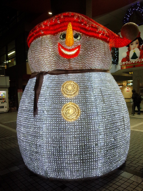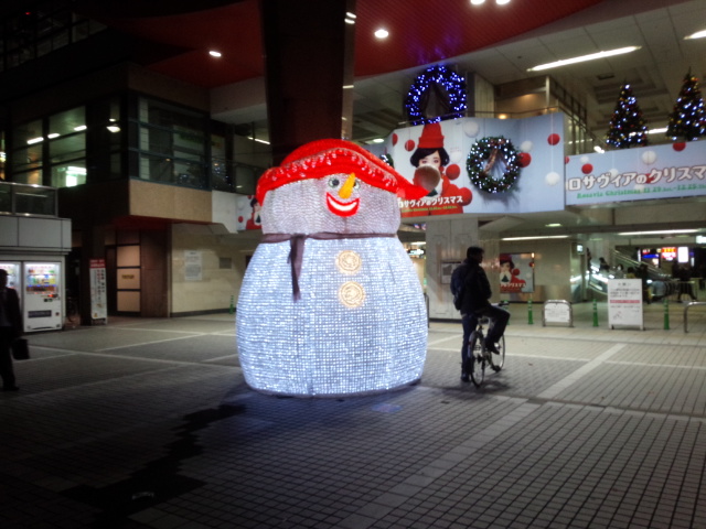 阪急(はんきゅう)茨木駅(いばらぎえき)に出会(であ)った大(おお)きな雪(ゆき)だるまです。