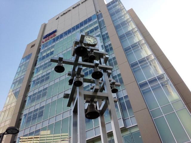 阪急(はんきゅう)梅田駅(うめだえき)からJR大阪駅(おおさかえき)に向(む)かう途中(とちゅう)のカリヨン広場(ひろば)にあるカリヨン時計(どけい)です。