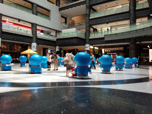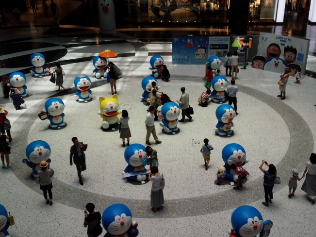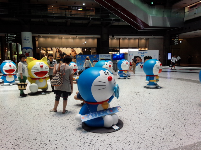 JR.大阪駅(おおさかえき)から阪急(はんきゅう)の梅田駅(うめだえき)に向(む)かう途中(とちゅう)『藤子不二雄展(ふじこふじおてん)』のポスターが目(め)につきました。ふらふらーっとグランフロントの方(ほう)へ足(あし)が向(む)かい、気(き)がつくと丸(まる)い広場(ひろば)のようなスペースにドラえもんがたくさん並(なら)んでいる光景(こうけい)に出会(であ)いました。