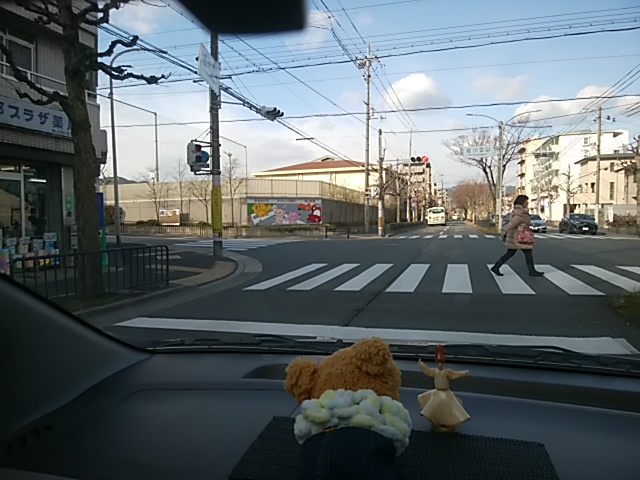 左前方に小さく見えるのが毎度おなじみの動物たちです。上賀茂神社の近い堀川通りの途中に見える壁の絵です。この絵が見えるともうそろそろ到着だと思えるのでホッとする絵です。