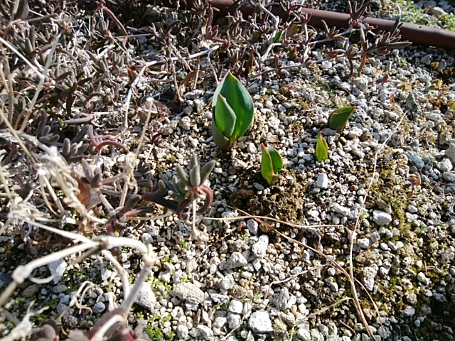 今年初めて露地でチューリップの芽を見つけました。小さな芽なのでおそらく昨年咲いたチューリップの球根から芽を出したのでしょう。その芽の前にマツバギクの太った葉っぱが地味に大きくなっていました。