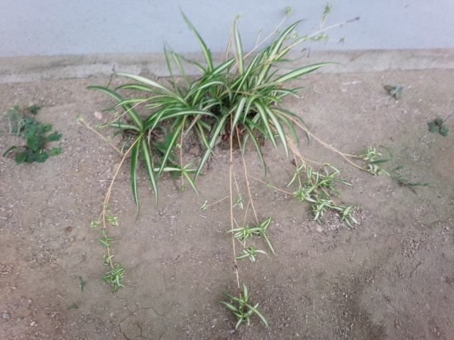 いつの間(ま)にか窓(まど)の下(した)に植(う)え付(つ)けたオリヅルランが勢力(せいりょく)を伸(の)ばしてきました。