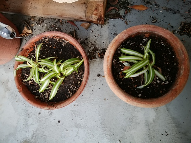 こちらはオリヅルラン、左の方の苗を素焼きの鉢に植え替えました。