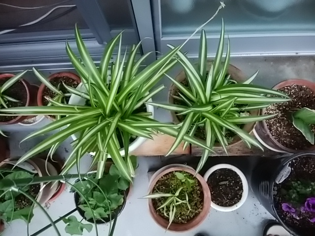 ベランダの植木鉢の植物たちを整列させてみました。オリヅルランの二鉢がかなり元気に復活してきました。ランナーの先には花芽も葉芽もつけ、暖かくなった季節を喜んでいます。