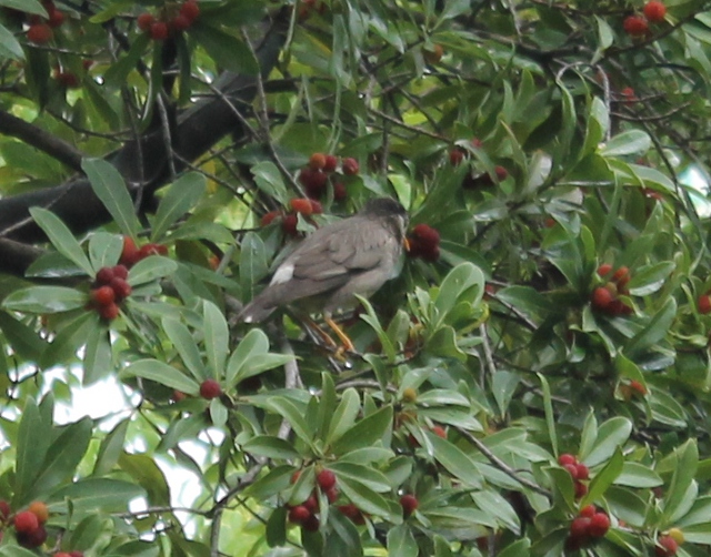 3年前にブログに載せた画像です。椋鳥がヤマモモの実を食べているのを撮影しました。