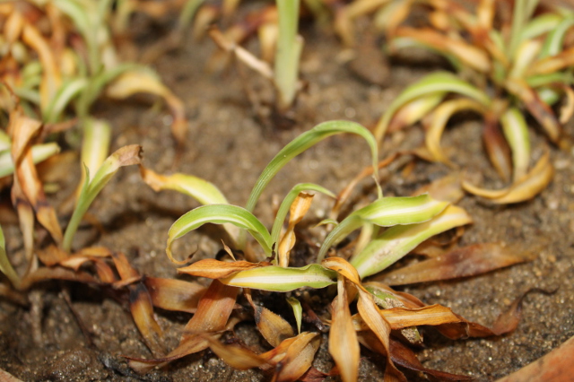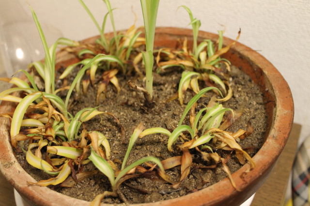 オリヅルランの子苗です。挿し芽したランナーの元からあった葉っぱは茶色く変色して枯れようとしていますが、中から新しい芽を出しています。この寒さでかなり弱っているようですが、何とか持ちこたえてくれています。
