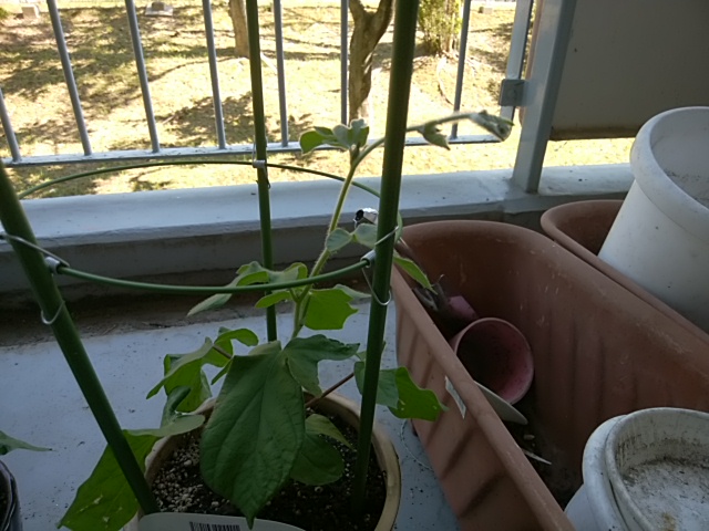 いつの間にか朝顔が蔓を伸ばし始めました。