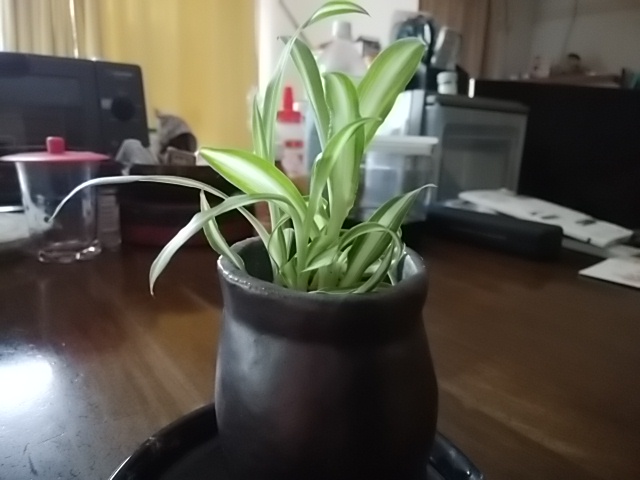 小さな鉢に少しだけ用土を入れてオリヅルランの子苗を軽く植え込んでいたのが、いつの間にか根付いてたようで葉を大きく伸ばし始めました。