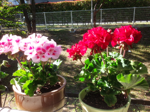 ゼラニュームの花が満開になりました。赤い花とピンクの花が朝日を浴びて輝いていました。開花した花の下の方にもつぼみが付き、上から順番に咲いています。一番下のつぼみが咲くころには最初に咲いた上の方の花が萎まないかと心配しています。この二つの鉢の左側にはちょっと種類の違ったゼラニュームの鉢があります。一番最初に咲いていて花が終わったと思ったのですが、またまた花芽をつけています。三つの鉢が咲きそろうのが楽しみです。