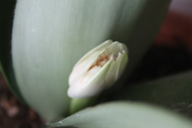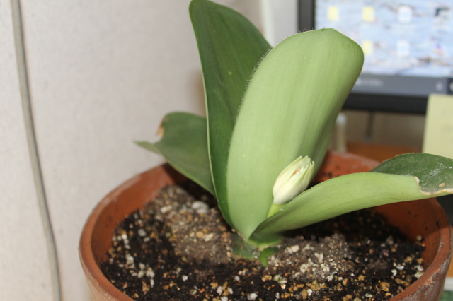ここから花芽の茎がぐーんと伸びて立派な花が咲くと思います。真面目な眉刷毛万年青です。