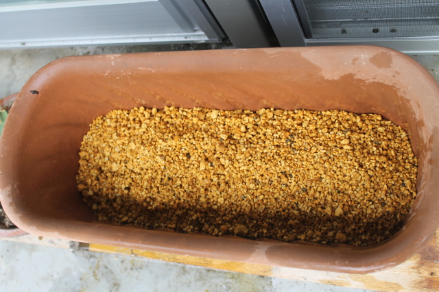 プランターにまず鉢底の石を入れてその上に鹿沼土を入れました。如雨露でかなり水をかけて土を湿らせました。