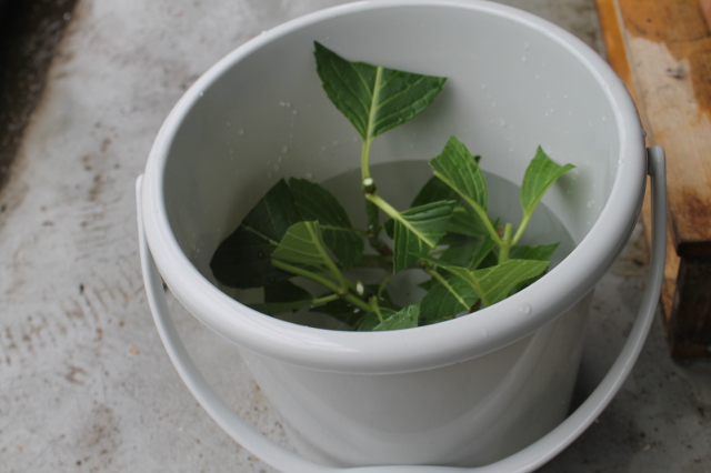 紫陽花の葉っぱをほぼ3分に1を残して切り取り、適当に切って水揚げをするためにバケツに水を入れて約1時間待ちました。