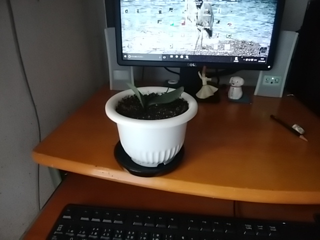 マユハケオモトの子株の横からさらに小さな株が出てきていたのですが、子株の葉に押さえ付けられるように葉っぱを出しているのを見て、株分けをしてあげることにしました。おおきな万年青の株から数えて孫株になるのかも知れません。デスクトップの前に置いて様子を見ることにしました。