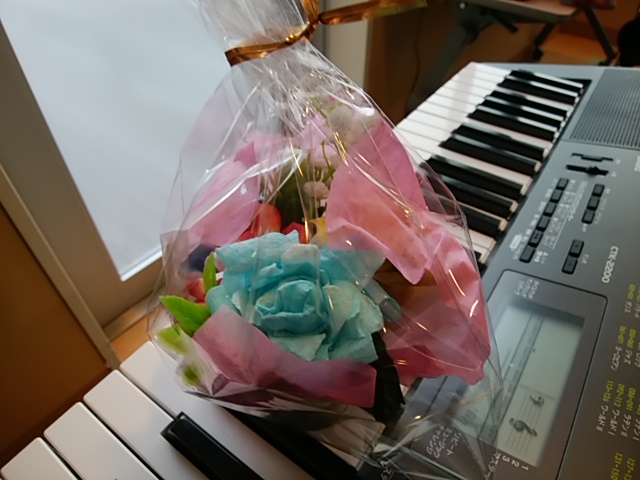 和紙をクチャクチャにして染料で色染めをしました。その和紙を使って薔薇花を作りました。かなり細かな作業でしたが、きれいな花束が出来上がりました。