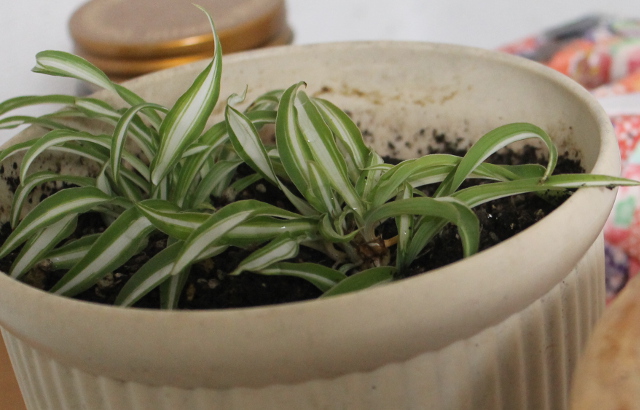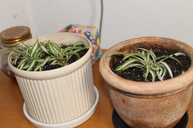 オリヅルランの子苗を余っている鉢に植え替えてみました。パソコンデスクの上の棚においたのでパソコンの前に座ると鉢しか見えません。そのうち葉が成長して伸びると見えてくるでしょう。