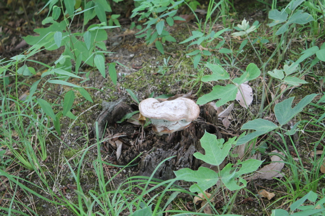 一昨日、雲の撮影をしていたときに緑地の中に入り込んだのですが、夏草の茂る中でふと足元を見ると朽ち果てた切株の真ん中に海の牡蠣のような形をしたキノコを見つけました。