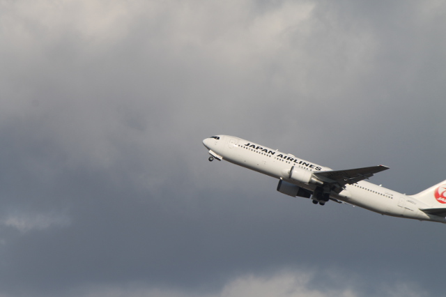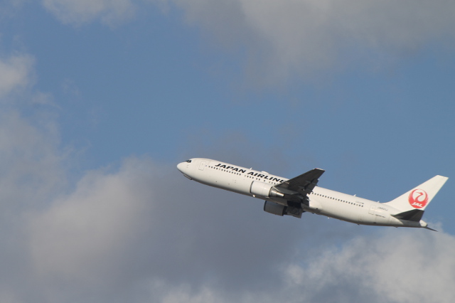 伊丹イオンの屋上の駐車場で撮影しました。寒風に曝されてきょうも待ちました。大きなエンジン音がして急に右手からJALが飛び立ちました。