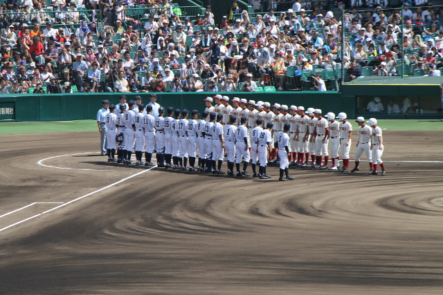 開会式(かいかいしき)直後(ちょくご)の京都(きょうと)、龍谷大(りゅうこくだい)平安(へいあん)と埼玉(さいたま)、春日部共栄(かすかべきょうえい)の試合前(しあいまえ)の挨拶(あいさつ)です。