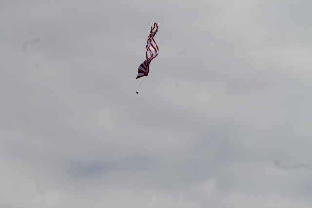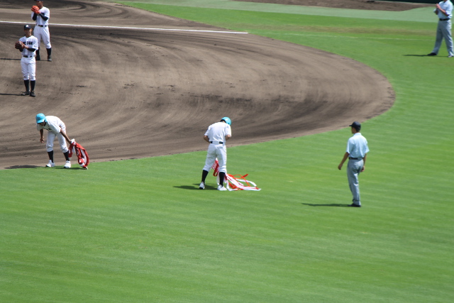 セカンドベース後(うし)ろの目標地点(もくひょうちてん)に旗(はた)とボールが落(お)ちてきました。係員(かかりいん)が走(はし)ってきてボールを外(はず)しました。